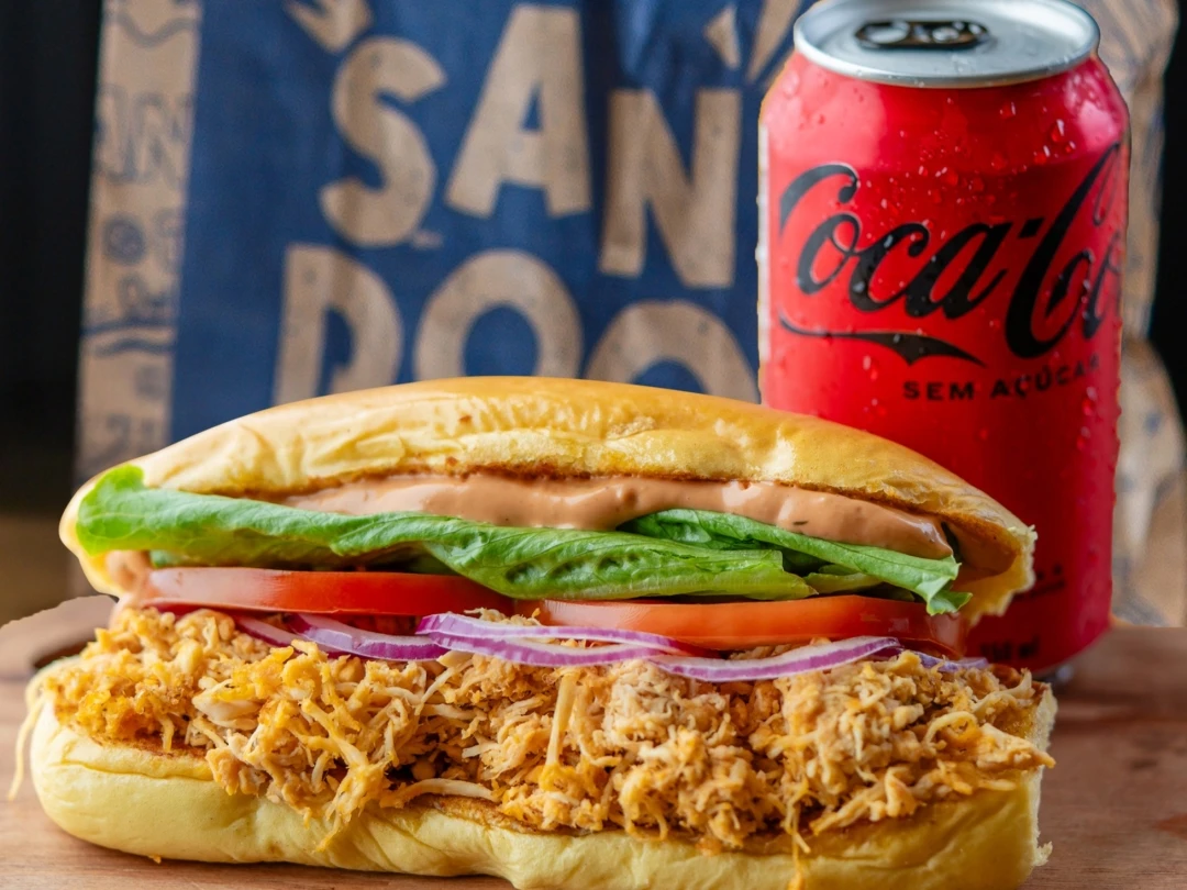 O combo perfeito pra quem não quer sair da dieta, Frango Salada + Coca-Cola Zero. Frango Salada: Filé de peito de frango desfiado, molho de queijos e temperos secretos, alface, cebola roxa e tomate frescos no pão baguete.